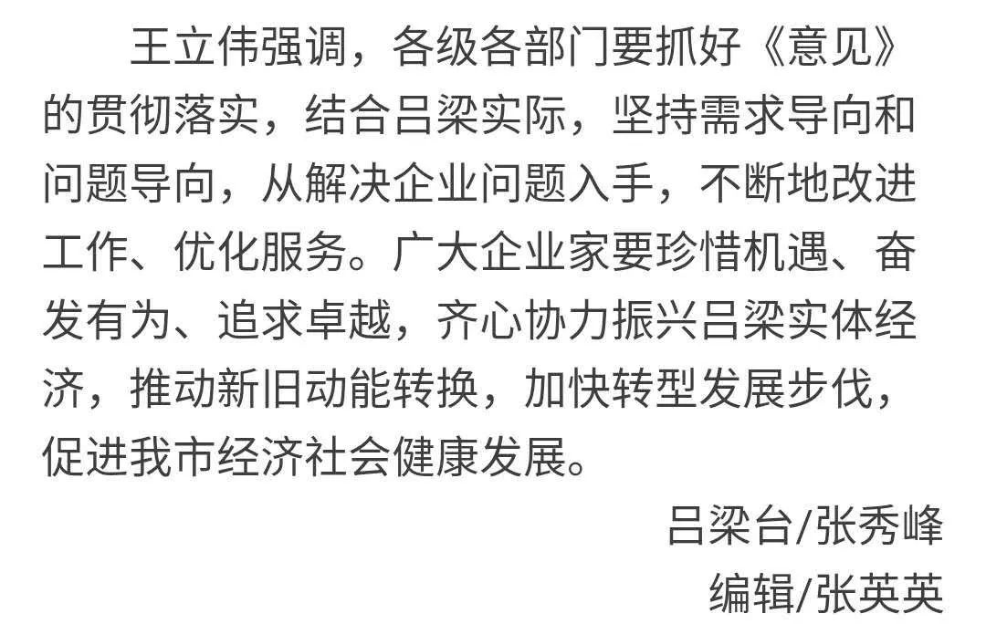 導語:10月13日,市委書記李正印主持召開我市深入學習貫徹落實中共中央、國務院《關于營造企業(yè)家健康成長環(huán)境弘揚優(yōu)秀企業(yè)家精神更好發(fā)揮企業(yè)家作用的意見》(下稱《意見》)座談會,共商呂梁經(jīng)濟發(fā)展大計。市長王立偉、市人大常委會副主任梁來茂、副市長楊巨才出席會議。9大產(chǎn)業(yè)13個行業(yè)協(xié)會負責人參加會議。